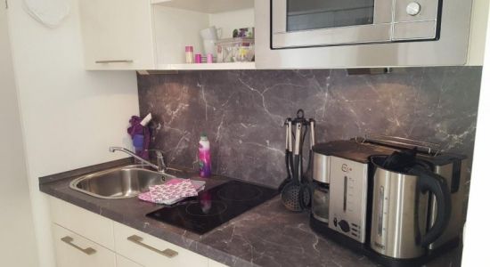 - Moderne Küchenzeile mit kleinen Extras (Tee, Kaffee, Dosenmilch, Gewürze, Spülmittel, Backpapier, Alufolie, Servietten), u.a. mit Mikrowelle