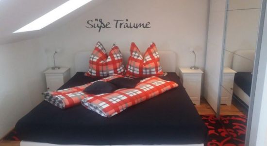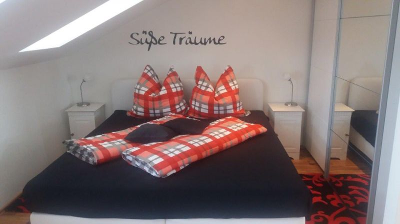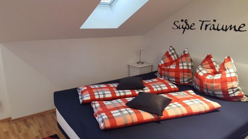 - Schlafzimmer mit gemütlichem Bett (1,80m x 2,00m) unter dem Dach und Flachbildfernseher