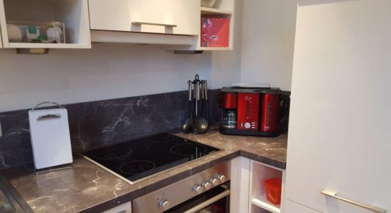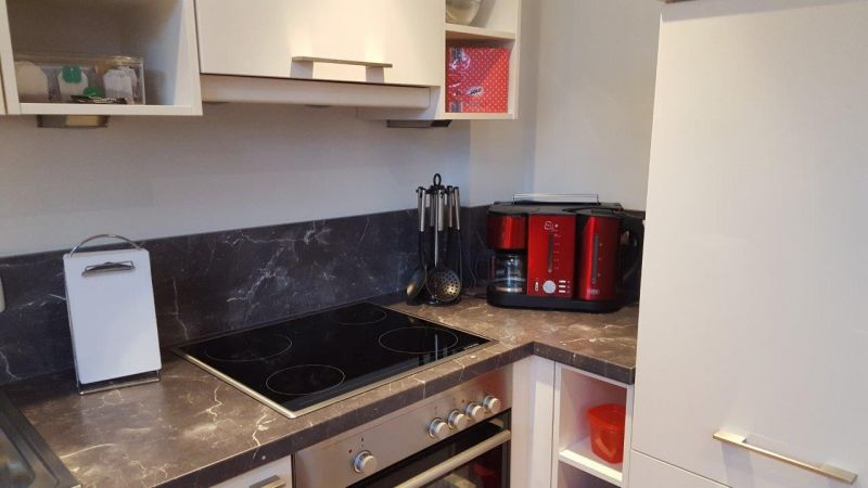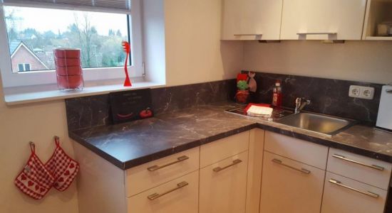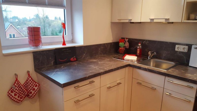 - Moderne Küchenzeile mit kleinen Extras (Tee, Kaffee, Dosenmilch, Gewürze, Spülmittel, Backpapier, Alufolie, Servietten), u.a. mit Backofen
